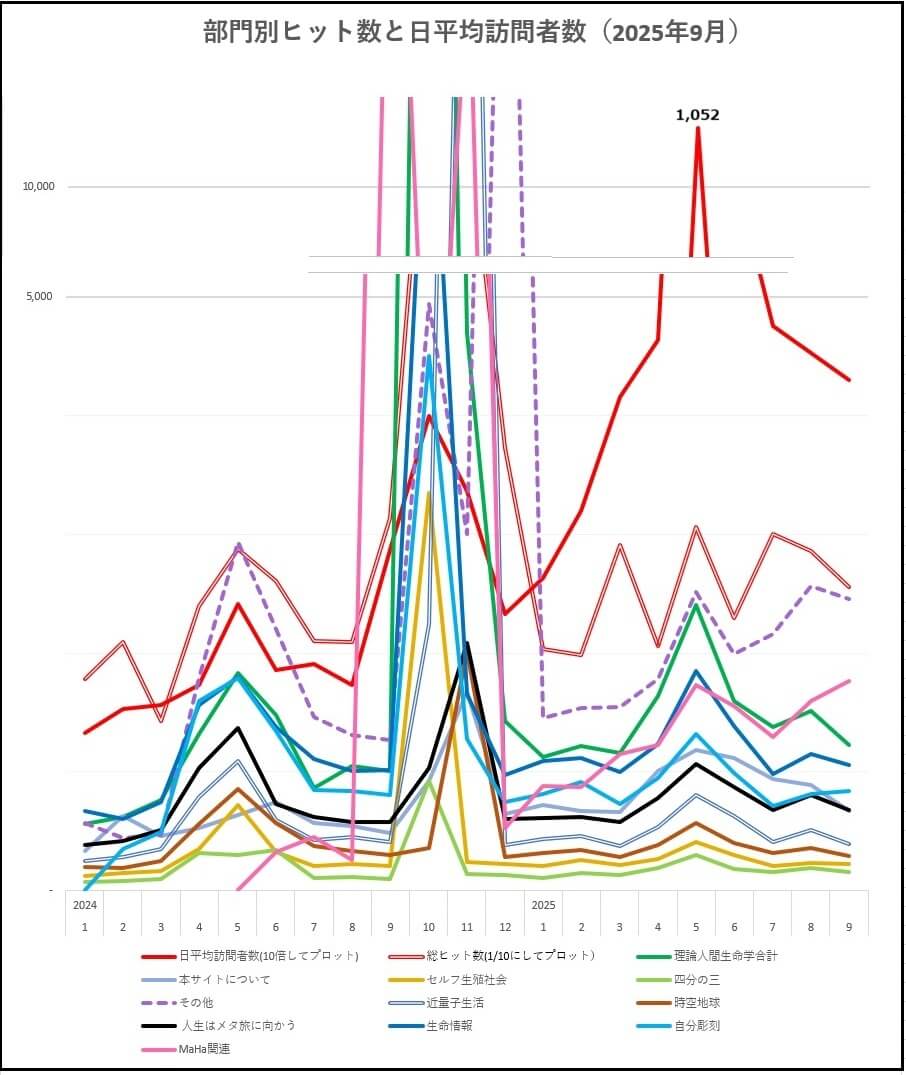 今月は「日平均訪問者数」(赤線)が8月の453人からさらに25人減って428人となりました(グラフ表示では一部をカット)。ただ、「総ヒット数」(赤二重線)がやや下降したものの比較的上位にあって、機械検索による引き上げ効果が引き続いている模様です。